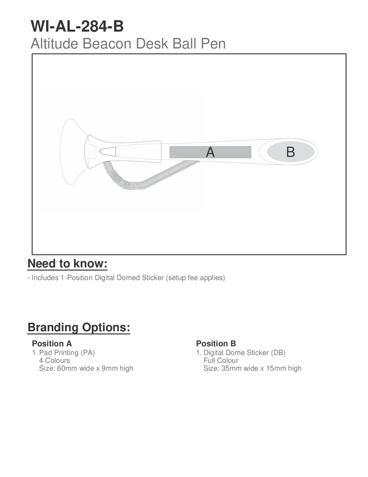 Designed for shop, pharmacy and reception counters, this large pen is attached to a base which can be firmly stuck on to a surface with the double-sided tape underneath the base. The top of the pen has a recess, designed for full colour dome branding.