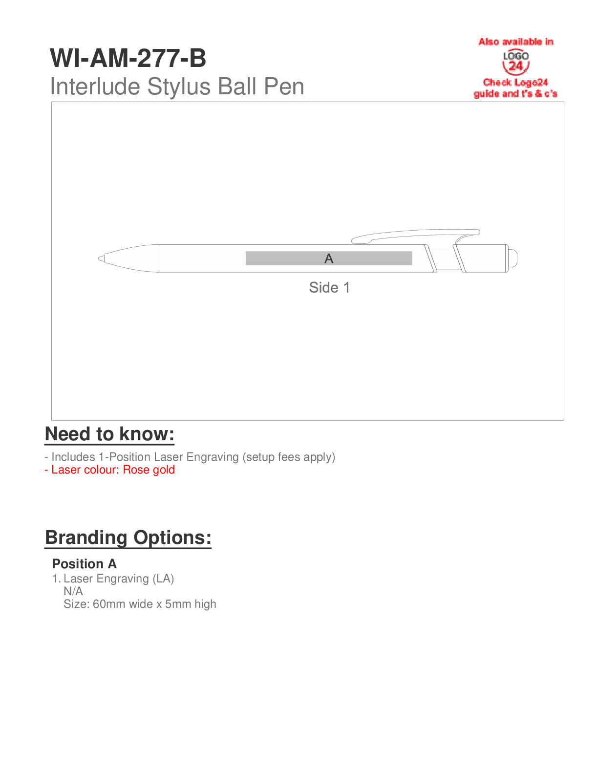 Made from aluminium, with a rubberised finish and shiny rose gold trims, this ball pen also features a rubber stylus for use with touchscreen devices. Beneath the surface of the barrel is a rose gold underlay, so when a logo is lasered on the barrel, a shiny rose gold finish is revealed, which matches the trims of the pen.