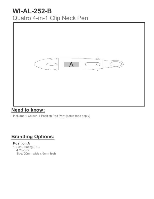 Get 4 different colour ink refills in 1 with this useful carabiner clip ball pen, which includes a slim, basic lanyard to carry on your neck. Consider adding your own custom-made and branded lanyard.
