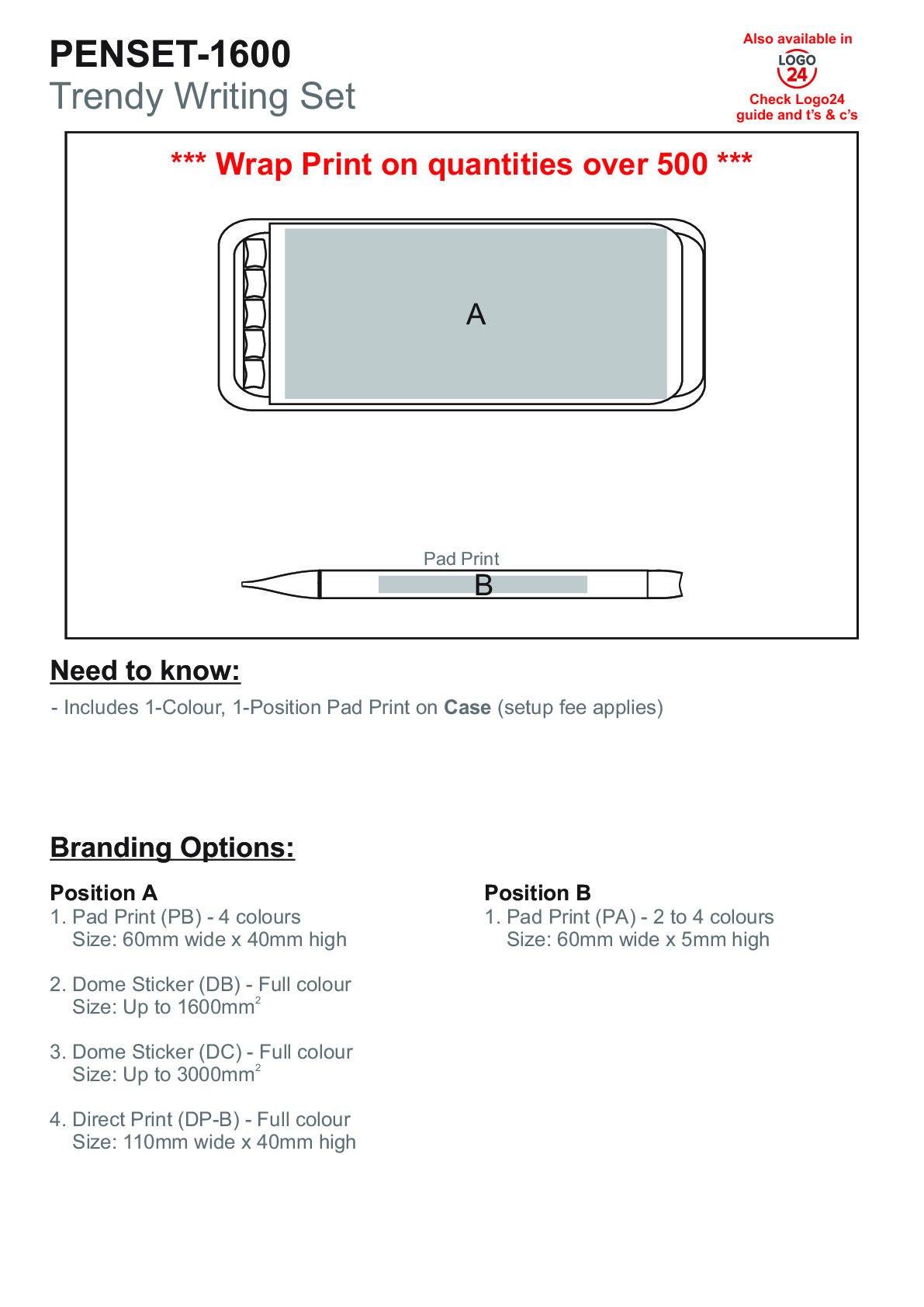 A great, affordable promotional idea for any event. Set features a pen with red ink, black ink, a pencil, a yellow highlighter, and an orange highlighter