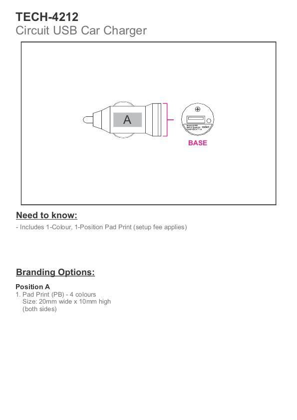 Charge up your marketing event with our on the go USB Car Charger. Available in 7 vibrant colours to suit your logo. charges mobile phones: Input: 12-24V. Output: 5V/1A • FCC & CE certification.