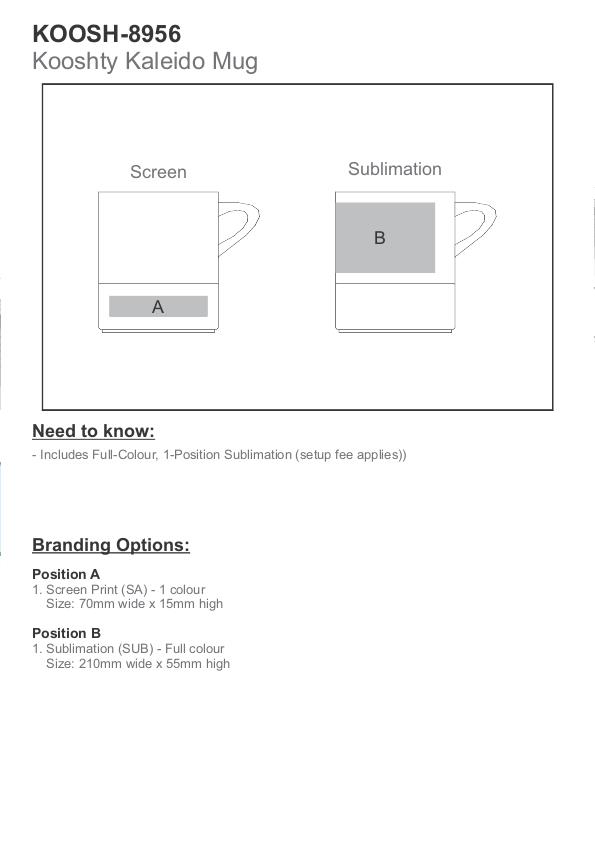 best quality A-Grade ceramic, the Kooshty Kaleido Mug has a fun design with a colourful silicone band accent. This is a sublimation mug, so it can be branded full-colour. It has a capacity of 320ml, and is supplied in a fun and colourful gift box.