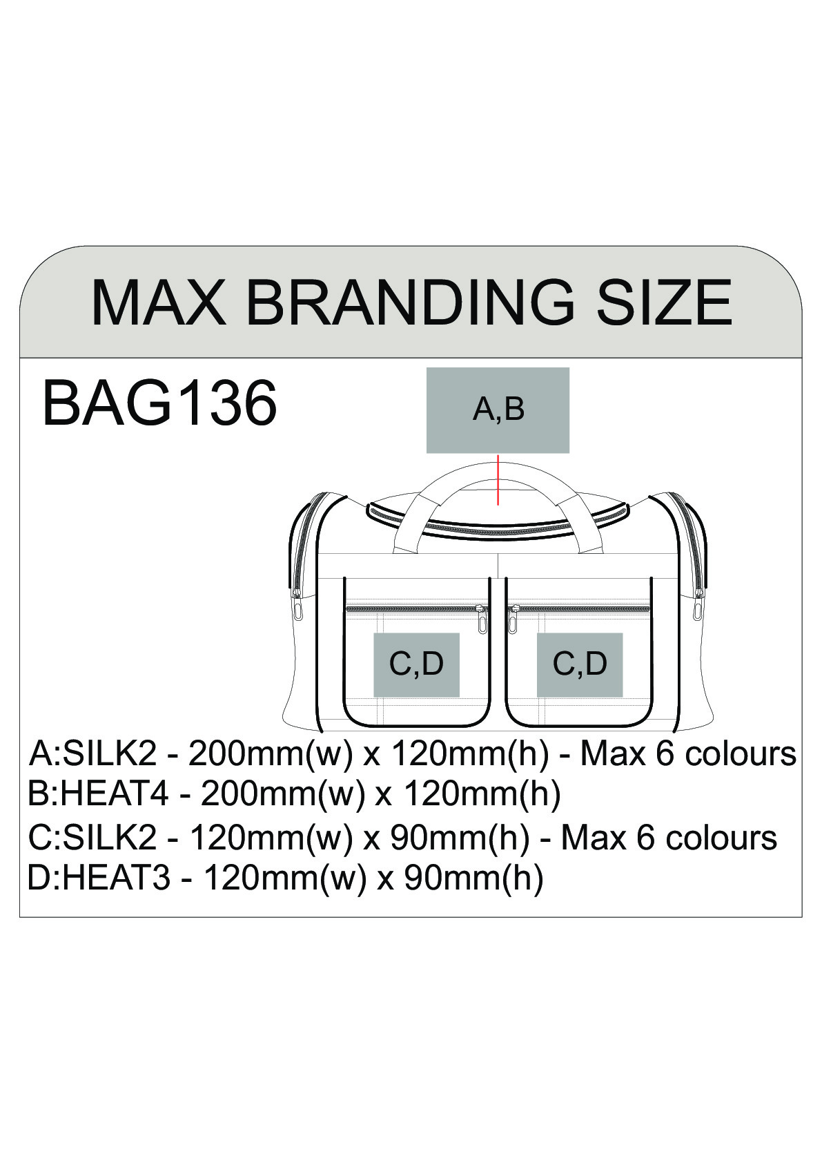 600D Polyester. Includes Main Zip Compartment, 2 Side Zip Compartments, 2 Front Zip Pouches, Carry Handle and Adjustable Shoulder Strap.