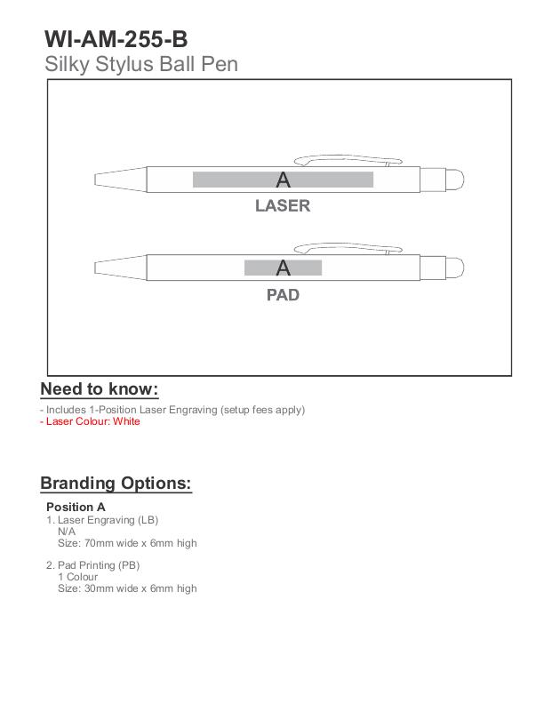 This metal ball pen is fitted with a stylus for use on mobile devices. The matte barrel has a soft touch feel, and laser engraving produces precise and clear logo branding.